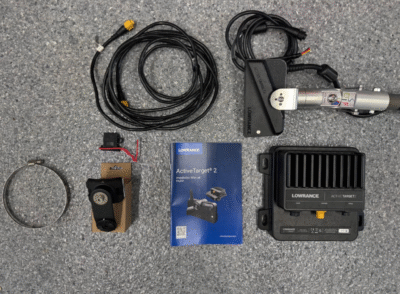 Lowrance Active Target 2 unit (Includes Black box and Transducer) with mounting hardware, power cable, manuals, and box. This unit was always kept inside and taken care of. No issues just upgrading to a new boat that is coming with new sonar units.